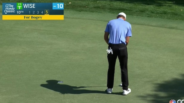 But things took an ugly turn at the 10th, where Wise found a greenside bunker and blasted his third shot to 27 feet. His par putt rolled three feet past the hole, leaving him with a knee-knocker for bogey. He missed, then missed the tap-in from less than three feet for double on the way back. Four putts. Woof:
